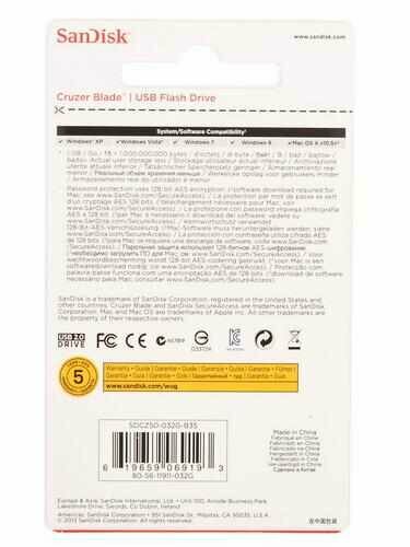 Практичная в эксплуатации память USB Flash SanDisk Cruzer Blade спроектирована знаменитой американской компанией SanDisk. Прибор весит всего 3 г и обладает крайне миниатюрными размерами, благодаря чему его легко постоянно иметь при себе, т. к. его можно хранить даже в небольшом портмоне. Все Ваши данные, хранящиеся на флеш-накопителе, будут надежно защищены системой безопасности, которая предполагает наличие пароля. Это значит, что даже если Вы когда-нибудь потеряете устройство, третьи лица никогда не получат доступ к информации. Конструкция лишена колпачка, что предполагает открытый тип разъема. Наличие специального отверстия в корпусе позволяет оснастить флеш-накопитель SanDisk Cruzer Blade шнурком и повесить его на «собачку» рюкзака, сумки или на связку ключей. Корпус изготовлен из сверхплотного пластика. Вместительность флешки равна 32 ГБ, что позволяет экспортировать и импортировать на сверхбыстрых скоростях большие объемы информации. Характеристики Память USB Flash 32 ГБ SanDisk Cruzer Blade [SDCZ50-032G-B35]: Вес: 3 г Высота: 7.4 мм Гарантия от производителя: 60 мес. Длина: 41 мм Дополнительные цвета: красный Интерфейс подключения: USB Type-A Код производителя: [SDCZ50-032G-B35] Количество ошибок при записи, измерено в лаборатории DNS: нет Конструкция корпуса: монолит Максимальная скорость записи данных: 4 Мбайт-сек Максимальная скорость записи данных, измерено в лаборатории DNS: 7.2 Мбайт-сек Максимальная скорость чтения данных: 16 Мбайт-сек Максимальная скорость чтения данных, измерено в лаборатории DNS: 29.7 Мбайт-сек Максимальная температура устройства при работе, измерено в лабор: 44° Материал корпуса: пластик Модель: SanDisk Cruzer Blade Объем памяти: 32 ГБ Объем памяти, измерено в лаборатории DNS: 29.2 ГБ Основной цвет: черный Поддержка OTG: нет Программное обеспечение в комплекте: SanDisk SecureAccess Стандарт USB: USB 2.0 Страна-производитель: Китай Тип: память USB Flash Ширина: 17.6 мм