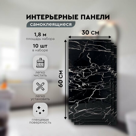Панели самоклеящиеся для стен 30х60 см. 10 шт. мрамор черный с белым