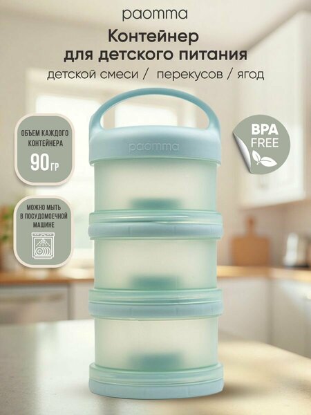 Контейнер для детского питания состоит из 3 отделений. Каждое отделение имеет специальную воронку с крышкой, что позволяет каждое отделение использовать отдельно и легко высыпать смесь в бутылочку. Контейнер удобно брать с собой в дорогу или подготовить несколько порций смеси для кормления на ночь. Широкий носик обеспечивает легкое и полное высыпание смеси из всех трёх отсеков. Крышка надежно закрывается. Каждый отсек контейнера вмещает 3 мерных ложки, 90 гр молочной смеси - отличный дозатор для детской смеси на улице, в гостях, ночью. В посуде для детей может храниться не только молочная смесь , но и пюре детское , творог и различные прикормы, детские сладости и снеки. Пищевой контейнер компактный, можно поместить в любую сумку. коляску. Изготовлен из 100% полипропилена, не содержит бисфенола А, ПВХ и фталатов и не взаимодействует с пищевыми продуктами, что делает его безопасным для использования в детском питании. Все детали контейнера для хранения детского питания можно стерилизовать, разогревать в микроволновой печи и мыть в посудомоечной машине. Благодаря своим компактным размерам и удобной форме контейнер не займет много места в сумочке, а наличие ручки поможет комфортно его переносить. Контейнер для детской смеси эргономичный, имеет надежную силиконовую ручку для крепления или переноса. Благодаря своей форме, контейнер для детского питания устойчив и легко поместится в несессер , сумку или рюкзак и станет поистине незаменимым помощником родителям малыша. Пищевой контейнер для детского питания Paomma представлен в трех цветах: сливочный, розово-коричневый и серо-зеленый. Это идеальный выбор для заботливых родителей, которые хотят сохранить здоровье своих детей и внести свой вклад в охрану окружающей среды. Контейнер под смесь можно легко мыть и использовать снова и снова, что делает его экологически чистым и экономичным в использовании. Контейнер для детского питания обеспечит вашему ребенку питание безопасной пищей.