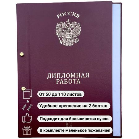 Папка Дипломная работа предназначена для переплета от 50 до 110 листов офисной бумаги плотностью 80 г/м2 формата А-4, перфорированных стандартным 2-х дырочным дыроколом. Комплектуется стяжками 15мм - 2 шт. В наших папках, Ваша работа будет оформлена в виде единого целого и аккуратного документа, что будет показывать ответственный подход и уважение к пройденному учебному процессу.* Папки выполнены из высококачественного бумвинила и картона. На папке нанесено золотое теснение специальной фольгой.* Инструкция закрепления работы. Проколите листы Вашей работы стандартным дыроколом на два отверстия (расстояние между отверстиями 8 см). Раскройте папку. Возьмите длинную часть стяжки, проденьте её в отверстие папки. Наденьте на неё все листы работы. Закройте папку. При этом конец стяжки будет виден через верхнее отверстие папки. Возьмите короткую часть стяжки и вкрутите в длинную. Проделайте те же действия со второй стяжкой. Работа закреплена.