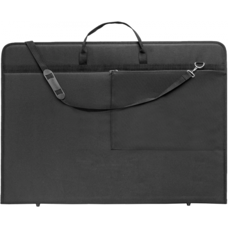 У папки есть внешний карман, формата А3 - для бумаг, или кистей. Размер 890x630x30 мм ●Наружный карман на молнии ●Наплечный ремень ●2 ручки ●Эластичная лента для фиксации листов ●Ткань – Полиэстер черный