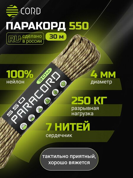 Паракорд 550 от фирмы Cord — это тонкий прочный шнур, сделанный из высококачественного 100% нейлона. Диаметр паракорда 550 Cord составляет всего 4 миллиметра. Легкий и надежный устойчив к гниению и выцветанию. Большой выбор обычных, светоотражающих и тактических хаки расцветок позволяет использовать паракорд в любых ситуациях. Его можно положить в носимый аварийный запас в сумку, оплести им рукоятку ножа или инструмента, декорировать браслет или ошейник для домашних питомцев, использовать для ремонта снаряжения или просто использовать как веревку или тросик. Незаменимая вещь при походе для оттяжки палаток и тентов, а также для любителей туризма и отдыха на природе. Спектр применения ограничен лишь вашим воображением! При занятии рукоделием паракорд не скользит и не собирается гармошкой даже при самой тонкой работе. Паракорд производится в России из российского сырья на современном оборудовании. Новый российский паракорд фирмы Cord по плотности, прочности и гладкости не уступает своим известным американским аналогам