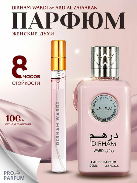 Духи Dirham Wardi от Ard Al Zaafaran - сладкие цветочные ароматы розы для женщин. Верхняя нота открывается нотами сладких ягод, малины, розового перца и бергамота. Нота сердца раскрывается цветочной смесью роз, пионов и ландышей, которая идеально сочетается с предыдущими фруктовыми нотами. Пачули, ирис, сандал и мускус в базе добавляют теплоту и глубину финишу. Чудесно романтичный, женственный, мягкий аромат, умело сочетающий фруктовую сладость с цветочными нотами и мускусом. Духи подходят на все случаи жизни.