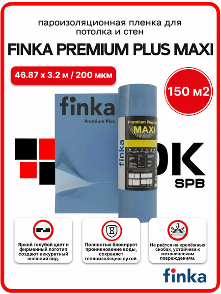 Finka Premium Plus MAXI — многослойная соэкструзионная пароизоляционная плёнка (150 м²) из первичного и металлоценового полиэтилена. Толщина 200 мкм обеспечивает повышенную прочность и надёжную защиту утеплителя и строительных конструкций от водяного пара. Подходит для пароизоляции кровли, стен и внутренних работ.