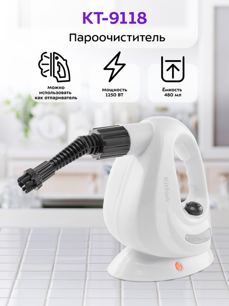 Пароочиститель КТ-9118 — многофункциональный прибор, способный заменить дезинфектор, стеклоочиститель и отпариватель. Используя струю горячего пара, пароочиститель отлично очищает поверхности и обеспечивает деликатную глажку вещей.