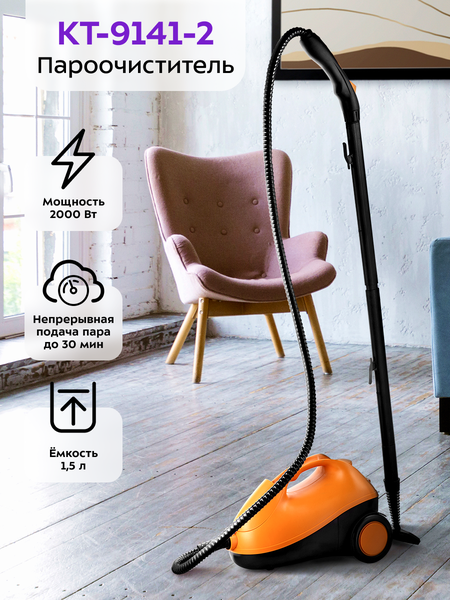 Пароочиститель КТ-9141 предназначен для уборки интерьеров, полов, поверхностей, а также отпаривания тканей. Горячий пар под давлением в 3,5 бар очищает разные поверхности, удаляет жир, известковые отложения, убивает патогенные микроорганизмы. Управление располагается на паровом пистолете. Чтобы начать подачу пара, необходимо зажать кнопку подачи пара. Чтобы предотвратить случайное нажатие на кнопку подачи пара, на паровом пистолете предусмотрен блокиратор. Кнопка «Вкл/Выкл» запускает нагрев бойлера и отключает устройство. Кнопка закрыта силиконовой заглушкой, которая предотвращает попадание влаги на кнопку. Индикатор готовности пара загорается, когда бойлер нагрелся и пароочиститель готов к подаче пара. Скребок для стекла используется для чистки окон, зеркал, кафеля. Струйная насадка подходит для чистки плинтусов. Щётки - для удаления любых стойких загрязнений. С помощью тряпки можно отпаривать одежду, шторы, очищать и дезинфицировать мягкую мебель. Щётка для пола предназначена для удаления грязи с напольных покрытий. На щётке по бокам расположены зажимы, которые удерживают тряпку. Горячий пар под давлением не только очищает, но и дезинфицирует. С КТ-9141 чистота полов гарантирована! Ёмкость бойлера пароочистителя 1,5 литра. Для удобного и безопасного наливания воды в бойлер в комплекте идут воронка и мерный стакан. Датчик давления поддерживает давление в бойлере в рабочем диапазоне. При достижении максимального значения нагрев выключается и включается вновь при падении давления. Крышку бойлера нельзя снять с прибора во время работы прибора. Круглая латунная щётка для удаления особо стойких загрязнений. Например, жира на гриле, решётке духовки или плиты. Струйная насадка подходит для очистки труднодоступных мест. Паровое сопло струйной насадки сужено, поэтому она создает мощную струю пара. На держателе для шнура питания, который идёт в комплекте и устанавливается сзади на корпус пароочистителя, можно хранить шнур питания. Так пароочиститель КТ-9141 займёт еще меньше места при хранении! Пароочиститель оснащён ручкой для переноски, а также специальным отсеком на корпусе для хранения парового пистолета. Колеса позволяют с лёгкостью перемещать пароочиститель, не поднимая его. Пароочиститель очищает поверхности без добавления бытовой химии.
