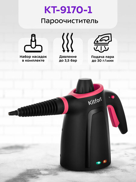 Пароочиститель Kitfort КТ-9170 – это универсальное решение для вашего дома. Этот прибор способен заменить дезинфектор, стеклоочиститель и отпариватель. Это устройство, которое точно пригодится вам, обеспечивая максимальную функциональность в уборке. Для подачи пара сдвиньте предохранитель в положение открытого замка и удерживайте кнопку подачи пара. При использовании пароочистителя вы заметите, как зелёный индикатор периодически выключается, что указывает на автоматический нагрев бойлера. Пароочиститель Kitfort KT-9170 выполнен по бойлерному типу работы. Специальная крышка на верхней части корпуса оснащена защитным механизмом. Для вашей безопасности крышка не открутится, пока температура и давление в бойлере не понизятся. Сопло струйной насадки создаёт мощную струю пара, способную напором выбить грязь из щелей и углублений. Угловой насадкой удобнее очищать углы и радиаторы отопления. Нейлоновая щётка используется для удаления механическим воздействием стойких загрязнений. Сопло струйной насадки создаёт мощную струю пара, способную напором выбить грязь из щелей и углублений. Угловой насадкой удобнее очищать углы и радиаторы отопления. Нейлоновая щётка используется для удаления механическим воздействием стойких загрязнений. Если установить насадку с резиновым скребком, то можно очистить любые гладкие поверхности вроде окон или зеркал. Надетая на насадку тряпка подойдёт для отпаривания ткани и обивки мягкой мебели. Гибкий шланг поможет добраться до труднодоступных мест. Большой комплект насадок позволит очистить весь дом без применения химических чистящих средств, что улучшает экологию дома и позволяет сэкономить на покупке чистящих средств. Для эффективной очистки и дезинфекции в комплекте идут 5 насадок.