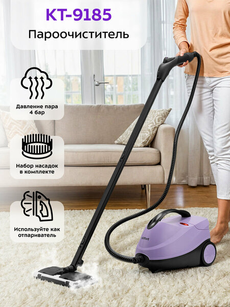 Kitfort КТ-9185 способен заменить паровую швабру, дезинфектор, стеклоочиститель, отпариватель. Главное преимущество пароочистителя – при помощи него можно проводить уборки без сильных чистящих средств, поэтому прибор безопасен для здоровья человека. При помощи насадки со скребком можно чистить окна и зеркала, а нейлоновая щётка запросто справится с налётом на кафеле или смесителе. Управление располагается на паровом пистолете. Вращение регулятора позволяет плавно регулировать интенсивность пара. Кнопка подачи пара располагается под пальцем. Предусмотрен блокиратор от случайного нажатия или для включения непрерывной подачи пара. Пароочиститель простой в управлении. На корпусе есть кнопка включения/выключения, индикаторы готовности пара и отсутствия воды. За счёт своей гибкости шланг поможет в уборке труднодоступных мест. А благодаря удобной ручке и компактному размеру пароочиститель можно без труда поднимать и доставать до мест, находящихся выше человеческого роста. В комплекте с пароочистителем идёт мерный стакан для удобного добавления воды в бойлер. Ёмкость составляет 1,5 л. При отпаривании вам может понадобиться держатель для одежды. Откройте крышку отсека для принадлежностей и вставьте удлинительную трубку. На неё установите держатель для одежды. Под крышкой пароочистителя предусмотрено место для хранения стальной и нейлоновой щёток. Паровой пистолет можно убирать в специальное отверстие на передней части корпуса пароочистителя. Шнур вы всегда можете намотать на специальный держатель. Пароочиститель оснащён ручкой для переноски, которую можно сложить, чтобы она не мешала во время работы. Также с двух сторон прибора есть колёса для транспортировки прибора при необходимости. В комплект, помимо различных насадок, входят также щётка для пола, тряпка, рамка для чистки ковров, удлинительные трубки, что делает КТ-9185 максимально универсальным устройством для очистки, глажки, дезинфекции самых разных поверхностей!