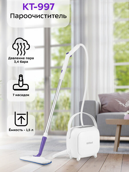 Стильный КТ-997 способен заменить паровую швабру, дезинфектор, стеклоочиститель, отпариватель. Горячий пар под давлением в 3,4 бара очищает разные поверхности, удаляет жир, известковые отложения, убивает патогенные микроорганизмы, отпаривает ткани. Скребок для стекла используется для чистки окон, зеркал, кафеля. Струйная насадка подходит для чистки плинтусов, щелей. Ворсовые и латунная щётки - для удаления стойких и особо стойких загрязнений. Широкая ворсовая - для очистки решётчатых поверхностей. Напольная щётка широкая и маневренная. Тряпка крепится на неё с помощью липучек. Вы можете использовать тряпку из комплекта или любую другую из натуральных волокон. Пароочиститель позволяет мыть полы без добавления какой-либо бытовой химии. При управлении паровым пистолетом кнопка подачи пара удобно располагается под пальцами. Вы можете нажать на фиксатор - пар будет выходить постоянно без удерживания кнопки подачи пара. Регулятор, располагающийся под крышкой, позволяет плавно регулировать уровень подачи пара. Включается прибор нажатием кнопки на корпусе. Зелёный цвет индикации вокруг неё указывает на то, что бойлер нагрет, красный - идёт процесс нагрева. За счёт своей гибкости шланг поможет в уборке труднодоступных мест. А благодаря удобному ремню и компактному размеру пароочиститель можно без труда поднимать и доставать до мест, находящихся выше человеческого роста. Пароочиститель можно просто катить благодаря маневренным колёсикам. В комплекте с пароочистителем идёт мерный стакан и воронка для удобного добавления воды в бойлер. Ёмкость бойлера составляет 1,5 л.