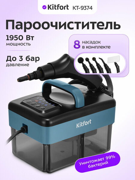 Пароочиститель Kitfort KT-9374 — это многофункциональный прибор, способный заменить дезинфектор и отпариватель. С помощью струи горячего пара устройство отлично очищает поверхности. Горячий пар под давлением может удалять грязь, жир и известковые отложения с различных поверхностей. Пар быстро исчезает, не оставляя следов влаги на поверхности. Устройство очищает паром без добавления бытовой химии, что является отличным выбором для аллергиков. Во время работы пароочистителя вода из резервуара подается помпой (водяным насосом) в бойлер, где преобразуется в пар. Пароочиститель KT-9374 предназначен для уборки интерьеров и поверхностей, выдерживающих влагу и высокую температуру. Пароочиститель очищает поверхности от пятен при помощи горячего пара, однако не все пятна могут быть удалены таким способом. В случаях сильного загрязнения используются дополнительные насадки из комплекта, а также чистящие средства, которые надо наносить на загрязнения. Насадки в комплекте помогут очистить труднодоступные или сильнозагрязненные поверхности. В комплекте есть насадка для отпаривания с тряпкой, для отпаривания одежды и очищения обивки мягкой мебели. Для очистки окон, зеркал и кафельной плитки используется резиновый скребок насадки для отпаривания. В случаях серьезного загрязнения используйте скребки, латунную или нейлоновые щетки, а также чистящие средства, которые надо наносить на загрязнения. Струйная и угловая насадки помогут очистить щели и углы. Благодаря наличию удлинительной насадки есть возможность добраться и очистить труднодоступные места. Шесть уровней подачи пара и режим подачи пара с водой позволят выбрать лучшие параметры для очистки разных типов поверхностей с разным уровнем загрязнения. Чем сильнее загрязнение, тем больше пара потребуется. Прибор безопасен для здоровья человека и не приносит вреда окружающей среде. Пароочиститель компактный и легкий. На корпусе есть ручка для переноски.