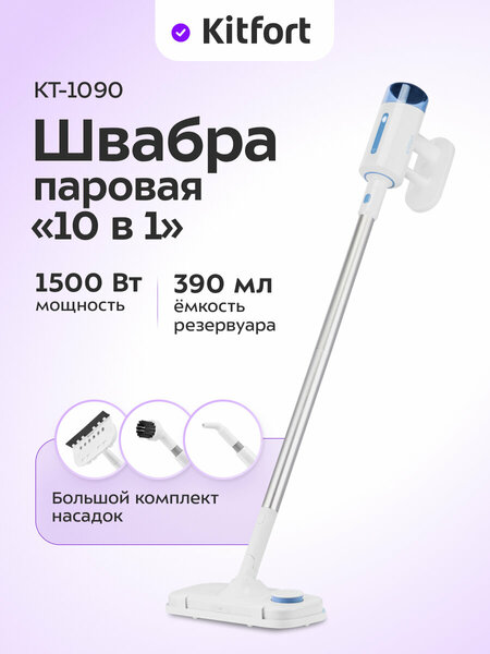 Стильная паровая швабра с функцией вертикальной парковки «2 в 1» КТ-1090 — универсальное и современное устройство, которое поможет избавиться от пыли и грязи с помощью мощной струи пара, а также продезинфицирует обрабатываемую поверхность. Прибор оснащён ручным модулем и насадками, что поможет очищать различные поверхности. Паровая швабра очистит раковину и плиту на кухне, зеркала и мебель без каких-либо химических средств — исключительно паром. При помощи специальных насадок из комплекта КТ-1090 вы сможете очистить напольные покрытия, раковину и плиту на кухне, зеркала, окна и плитку в ванной без каких-либо химических средств, исключительно паром. На насадку для отпаривания устанавливается скребок для очистки окон и зеркал. Струйная и угловая насадки помогут очистить щели и углы. Нейлоновая и латунная щётки нужны для удаления стойких загрязнений, когда требуется применить механическое воздействие. Принцип действия паровой швабры основан на воздействии горячего пара на загрязнения. Пар проникает внутрь загрязнения, размягчая и растворяя его, а затем с помощью тряпки частички грязи смываются. Высокая температура пара способствует процессу очистки. Паровая швабра оснащена резервуаром для воды ёмкостью 390 мл, что позволяет производить непрерывную уборку до 16 минут в зависимости от выбранного уровня подачи пара. Тряпка для пола устанавливается на напольную щётку с помощью липучек. Её можно стирать в стиральной машине в тёплой воде. В комплекте есть рамка для ковра, которая обеспечивает лёгкое скольжение щётки во время чистки. У швабры есть два режима подачи пара: вертикальный и горизонтальный. При горизонтальной подаче пар выходит перед тряпкой для пола и сразу попадает на загрязнение, размягчая его сильнее, чем при вертикальной подаче пара, когда он проходит через тряпку. Паровая швабра КТ-1090 простая в использовании, а также обладает большим углом наклона при уборке. Уборка с ней будет проходить быстро и легко.