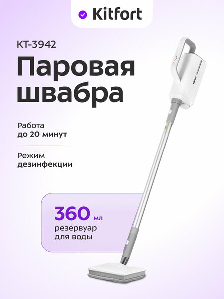 Универсальный помощник! КТ-3942 поможет избавиться от грязи с помощью мощной струи пара и продезинфицирует обрабатываемую поверхность. При помощи парового шланга и насадок из комплекта можно очистить не только пол, но и раковину, плиту, зеркала и окна без химии — только паром. Съёмный резервуар для воды Устройство оснащено съёмным резервуаром для воды ёмкостью 360 мл, что позволяет производить непрерывную уборку до 15-20 минут в зависимости от интенсивности выходящего пара. Насадки на все случаи жизни Струйная насадка – для щелей и углов. Стальная и нейлоновая щётки, а также щетка-скраб – для сложных загрязнений. Для одежды и мягкой мебели - насадка для отпаривания. Для зеркал и плитки на насадку для отпаривания устанавливается насадка со скребком. Возможность отпаривания вещей Насадка для отпаривания используется для отпаривания одежды и чистки обивки мягкой мебели. Насадка также может быть использована для чистки окон, зеркал, душевых кабинок, кафеля и других гладких поверхностей, стойких к температуре пара и влажности. Простое управление Кнопка «Пар» включает и выключает подачу пара, а также циклически переключает два уровня подачи пара. Нажмите на кнопку, чтобы включить подачу пара на низком уровне. При повторном нажатии - включится высокий уровень подачи пара. Полный комплект В комплект к швабре идут несколько насадок: струйная, нейлоновая, стальная, щётка-скраб, насадка для отпаривания с дополнительным резиновым скребком и паровой шланг. Так же тряпка для пола и мерный стаканчик.