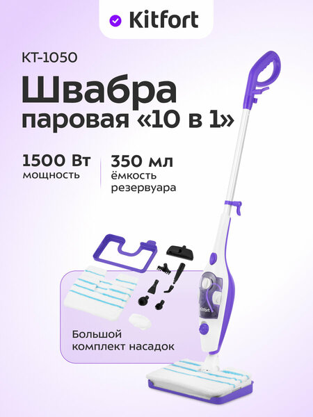КТ-1050 – устройство, способное эффективно устранить загрязнения и провести дезинфекцию поверхности с помощью пара. Прибор можно использовать как 5 устройств: паровая швабра, ручной пароочиститель, стеклоочиститель, отпариватель и дезинсектор. Тряпки для пола устанавливается на напольную щётку с двух сторон с помощью липучек. Их можно стирать в стиральной машине в тёплой воде. В комплекте есть рамка для ковра, которая обеспечивает лёгкое скольжение щётки во время чистки. В комплекте идут одна угловая и плоская насадка для труднодоступных мест, например щели и углы. Три нейлоновые щётки для стойких загрязнений, когда требуется механическое воздействие. Чтобы помыть окна, зеркала и кафельную плитку, присоедините насадку – скребок. Насадка для отпаривания со скребком и тряпочкой используется для отпаривания вещей и других текстильных предметов. Резервуар для воды 350 мл. Этого хватает на 20 минут уборки. Резервуар снимается со швабры, поэтому его можно легко наполнить или вымыть. Кнопка над резервуаром включает и выключает нагрев, а регулятор под ним меняет уровень подачи пара. При хранении швабра не займёт много места. Шнур длиной 4,9 м не сковывает и не ограничивает ваше перемещение во время уборки. На ручке и корпусе швабры имеются держатели для смотки шнура. Множество насадок, которые идут в комплекте с паровой шваброй, справятся с труднодоступными местами и сложными поверхностями. Стакан для наливания воды служит для удобного и безопасного наливания воды в резервуар.