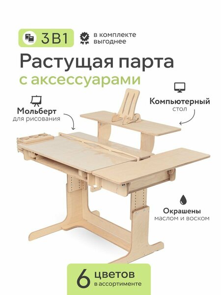 Детская парта трансформер «Ученик» с покрытием акрил + масло — функциональное и надёжное решение для организации комфортного учебного пространства. Подходит для малышей, первоклассников и школьников до 11 класса. Эта растущая парта для школьника рассчитана на рост от 105 до 180 см и регулируется по высоте от 48 до 78 см. Используется как со стандартным детским стулом, так и с растущим. Для детей до 130 см стол можно использовать и в положении стоя — отличное решение, чтобы чередовать статичную и активную позу. Парта растущая трансформер позволяет регулировать наклон столешницы под разные виды занятий: 0° — как стандартная детская парта для письма; 15–30° — превращается в письменный стол для школьника; 45–60° — удобно читать, лепить, заниматься творчеством; 70° — превращается в мольберт для рисования стоя. Столешница лёгкая и регулируется удобным рычагом — с этим справится даже первоклассник. В вырез боковой полки удобно вставлять руку при наклоне. Комплектация включает всё, что нужно для удобной учёбы: фиксатор бумаги для закрепления тетради или листа, 2 боковых крючка для рюкзака или сумки, 3 полки: боковая (универсальная — справа/слева), задняя (регулируемая по высоте), нижняя (для хранения учебников). Ширина полок — 25 см, на них легко помещается монитор и школьные принадлежности. Полки выдерживают до 20 кг. Общий размер рабочей зоны с полками — 105×80 см. Мы уделили внимание деталям: дополнительные планки усиливают конструкцию и делают её устойчивой. Парта выдерживает вес до 80 кг, не шатается и не скрипит даже при активной нагрузке. Материал — фанера 15 мм, высшего сорта. Покрытие — акрил + мебельное масло: экологично, без запаха, безопасно для детей. Такое покрытие защищает поверхность от пятен, влаги и царапин, подчёркивая текстуру дерева. Стол-парта «Ученик» — это удобное и продуманное рабочее место, созданное по мотивам лучших школьных парт. Он адаптирован под российские условия, протестирован на реальных семьях и подходит для ребёнка на все годы учёбы.