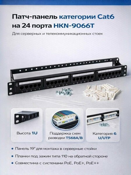 Патч-панель 19" категории 6 (Cat6) на 24 порта предназначена для организации структурированной кабельной системы и монтажа в серверные и телекоммуникационные стойки формата 19", высота 1U. Неэкранированная конструкция U/UTP. Оснащена разъёмами RJ-45 с тыльной стороны — планками под зажим типа 110. Поддерживает схемы разводки T568A и T568B. Обеспечивает передачу данных в сетях Ethernet до 1 Гбит/с на расстоянии до 100 м в соответствии с категорией 6. При соблюдении требований к каналу возможна передача данных до 10 Гбит/с на расстоянии до 55 м. Совместима с системами питания по Ethernet (PoE, PoE+, PoE++) при использовании соответствующего активного оборудования и кабеля категории 6. Подходит для построения локальных вычислительных сетей в офисах, серверных и коммерческих помещениях.