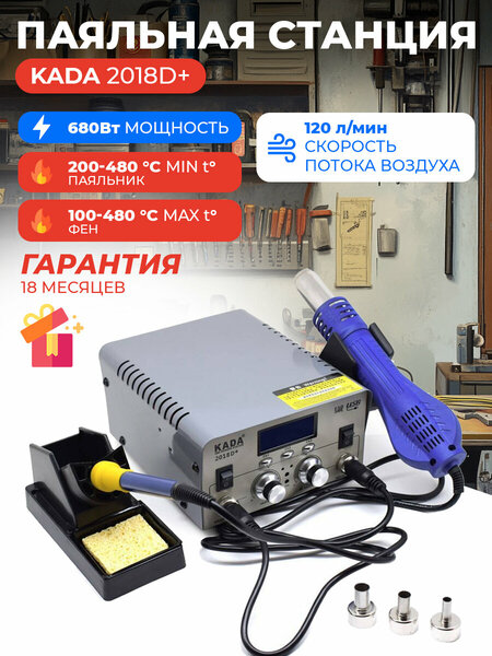 Паяльная станция KADA 2018D+ 680 Вт - многофункциональный строительный инструмент для пайки, ремонта электроники, мобильных телефонов, бамперов автомобилей, термоусадочных работ, ручной установки радиоэлементов, монтажа, демонтажа электронных компонентов BGA, SMD, PLCC, и др. Электрический паяльник с керамическим нагревателем (t 200-480С) и компрессорный фен (t 100-480C) подойдет как для домашнего, так и для профессионального использования. Благодаря подставке для электропаяльника, губке и держателю для фена можно осуществлять безопасную работу без соприкосновения паяльника/термофена со столом и случайных ожогов. Пластиковая рукоятка со специальным прорезиненным покрытием обеспечивает надежный и уверенный захват инструмента. Набор для пайки имеет 3 насадки на фен, можно использовать удобные сменные жала для паяльника, тип 900М. Станция обеспечивает возможность регулировки и поддержки заданной температуры, есть система терморегуляции. Есть 3 хранилища для температуры потока воздуха. Скорость потока воздуха: До 120 л/мин