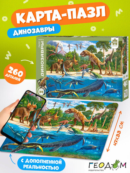 Карта-пазл «Динозавры» состоит из 260 деталей, которые выполнены из высококачественного картона. На пазле представлена реконструкция древних ящеров и их среды обитания, выполненная художником с палеонтологической точностью. Собирая игру-головоломку, Ваш малыш узнает много нового об этих удивительных существах. В процессе игры благодаря деталям разнообразной формы ребенок развивает мелкую моторику, усидчивость, логику и мышление, воображение и способность анализировать.