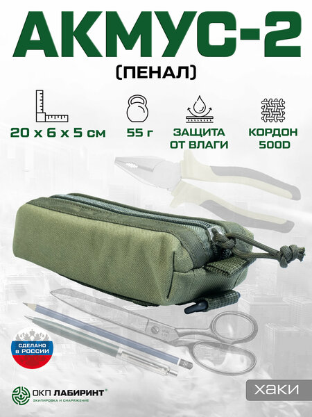 Пенал Акмус-2 производства ОКП «Лабиринт» предназначен для хранения и переноски канцелярских товаров, средств личной гигиены, небольших инструментов и прочих предметов подходящего размера. На оборотной стороне нашиты 5 ячеек MOLLE. Пенал изготовлен из прочной водонепроницаемой ткани Кордон 500D с полиуретановым покрытием. Обладает повышенной прочностью, устойчивостью к истиранию, водоотталкивающим свойством, легко очищается от загрязнений. Надёжность изделий ОКП «Лабиринт» обусловлена использованием материалов повышенной прочности и многоразовой прошивкой с закрепками. Швы выполнены армированными нитками повышенной прочности Титан 20, Титан 40 и Титан 60. Предоставляем 1 год гарантии на все товары нашего производства.