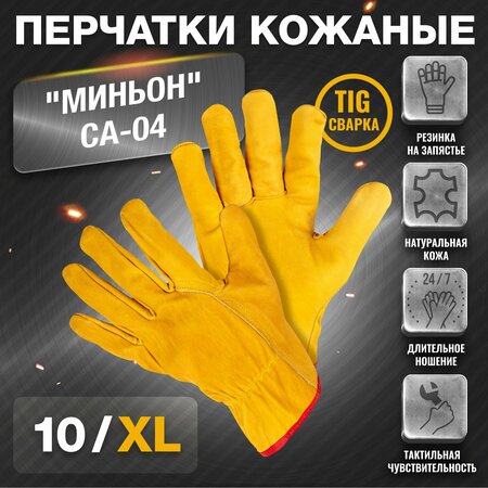 Перчатки кожаные мягкие «Миньон» СА-04 изготовлены из мягкой коровьей кожи сорта АВ. Перчатки предназначены для защиты рук от общепроизводственных загрязнений, истирания, обеспечивают высокий комфорт, рекомендованы для продолжительного ношения, при работе с инструментом и для водителей. Области применения – аргонодуговая сварка (TIG), машиностроение, слесарные и другие работы. Перчатки Миньон обеспечивают хорошие показатели манипулирования, тактильной чувствительности и комфорта при высоких показателях механической защиты. тактильная чувствительность Перчатки подходят как для сварки, так и при работе с другими инструментами, т. к. материал, из которого они сделаны, обеспечивает хорошие показатели манипулирования для лучшей подвижности и чувствительности. длительное ношение Перчатки изготовлены из мягкой натуральной кожи, обеспечивают высокий комфорт и рекомендованы для продолжительного ношения при работе с инструментом, также подходят для других видов работ.