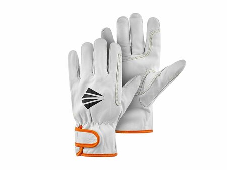 Рабочие перчатки из натуральной кожи имеют фиксатор на манжете, что обеспечивает лучшую посадку на руке. Ладонь дополнительно укреплена износостойкой нашивкой. Сфера использования: для работ, связанных с высокими истирающими, механическими нагрузками.