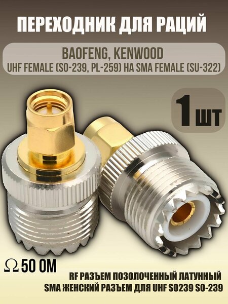 Переходник для рации Baofeng и Kenwood: надежное и удобное подключение антенн Совместимость с различными антеннами Переходник для рации Baofeng и Kenwood UHF female (SO-239, PL-259) на SMA female (SU-322) позволяет использовать различные антенны для рации, включая антенны для рации Baofeng и Kenwood. Это обеспечивает гибкость в выборе антенны для конкретных условий использования. Прочная конструкция и защита от влаги Переходник для рации Baofeng и Kenwood изготовлен из качественных материалов и имеет прочную конструкцию, что обеспечивает стабильную связь между антенной и радиостанцией. Защита от влаги позволяет использовать переходник в различных погодных условиях. Беспроводное подключение и шумоподавление Переходник для рации Baofeng и Kenwood оснащен беспроводным подключением и не имеет функции шумоподавления, что обеспечивает быстрое и простое подключение антенны к радиостанции. Стильный дизайн и комплектация Переходник для рации Baofeng и Kenwood имеет стильный медный или бронзовый цвет, который гармонично впишется в любой интерьер. В комплект поставки входит один переходник. Выбирая переходник для рации Baofeng и Kenwood, вы получаете надежное и удобное устройство для подключения различных антенн к вашим радиостанциям, а также возможность выбора антенны для конкретных условий использования. Антенный переходник SU-322. ВЧ переходник SMA мама - UHF мама (UHF розетка PL-259 (SO-239) на SMA розетка). Предназначен для подключения внешних антенн к рациям Baofeng, Kenwood и прочим с разъемом SMA male. Переходник для раций Baofeng, Kenwood UHF female (SO-239, PL-259) на SMA female (SU-312) / UHF мама(SO-239, PL-259) на SMA мама(SU-312)