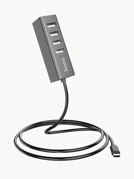Подключите к ноутбуку хаб Hoco HB1 – и у него вместо одного USB-порта будет 4 разъема для подключения мышки, геймпада, флешки и другого USB-гаджета. Благодаря поддержке технологии Plug and Play для корректной работы концентратора не требуется установки дополнительного программного обеспечения. Просто вставляете его в разъем и начинаете пользоваться. Переходник Hoco HB1 крепкий и легкий. Его корпус изготовлен из алюминиевого сплава, обладающего высокой прочностью, устойчивостью к механическим повреждениям и износостойкостью. С одного из торцов к металлическому корпусу прикреплен длинный и гибкий кабель со штекером USB для подключения к ноутбуку. У концентратора 4 USB-порта, работающих по стандарту 2.0 и позволяющих передавать данные со скоростью до 480 Мб/сек. Сможете подключить в них четыре устройства одновременно. Совместимость Разветвитель можно использовать для подключения различных USB-гаджетов к компьютеру или ноутбуку. Портативность У Hoco HB1 компактные размеры и небольшой вес. Он не займет много места на рабочем столе и его удобно носить с собой на работу или брать в поездку. Технические характеристики хаба Hoco HB1 Line Machine USB to 4xUSB - Интерфейсы: вход: USB; выход: 4хUSB 2.0 Скорость передачи данных USB: до 480 Мбит/с Рабочее напряжение/рабочий ток: 5 В/500 мА Материалы: алюминиевый сплав Совместимость: ноутбуки, компьютеры с разъемом USB Длина кабеля: 80 см Размер: 78х25х25 мм Вес: 63 г