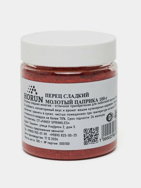 Перец сладкий молотый (Паприка) — натуральная пряность с мягким вкусом, ярким ароматом и насыщенным цветом Паприка — это популярная натуральная пряность, получаемая из высушенных и измельчённых сладких сортов красного перца (Capsicum annuum). Она отличается мягким, слегка сладковатым вкусом, насыщенным ароматом и характерным красно-оранжевым цветом. Благодаря своей универсальности паприка используется во многих кухнях мира — от венгерской и испанской до восточной, среднеазиатской и кавказской. Это одна из самых популярных специй на каждой кухне, ценимая не только за вкусовые качества, но и за полезные свойства и натуральность. Молотая паприка придаёт блюдам красивый цвет, глубину вкуса и деликатную пряную ноту, при этом не обладает остротой — в отличие от жгучего перца. Она отлично подходит для повседневной готовки, диетических блюд и детского питания. Что такое паприка? Паприка — это специя, изготовленная из сушёных плодов сладкого перца, которые измельчаются в мелкий порошок. В зависимости от сорта и степени обработки она может варьироваться по цвету (от ярко-красного до кирпично-коричневого) и аромату (от нейтрального до копчёного). Паприка производится без добавления соли, сахара, красителей, ароматизаторов или консервантов. Только 100% натуральный высушенный перец. ✅ Полезные свойства: Богата витамином C — способствует укреплению иммунитета Содержит каротиноиды (в том числе бета-каротин) — поддерживают здоровье кожи и зрения Антиоксиданты — защищают клетки от окислительного стресса Улучшает пищеварение — стимулирует выработку желудочного сока Натуральный источник капсаицина — в малых дозах оказывает мягкий согревающий эффект Без остроты — подходит для людей с чувствительным желудком и детей Улучшает цвет и аромат блюд — делает еду более аппетитной и привлекательной Применение в кулинарии: Паприка — универсальная специя, которую можно добавлять практически в любые блюда. Она прекрасно сочетается с мясом, рыбой, овощами, крупами и бобовыми. Где использовать: – супы, бульоны, харчо, шурпа – мясо: тушёное, жареное, запечённое, гриль – плов, ризотто, паэлья, гуляш – овощные рагу, картофель, запеканки – соусы, подливы, паста, кетчуп – маринады и заготовки – салаты и закуски – омлеты, яичница, бутерброды – домашняя колбаса и мясные рулеты – сыр, творог, масляные смеси – оформление блюд перед подачей Паприку можно добавлять как в процессе приготовления, так и посыпать готовые блюда. Её вкус раскрывается особенно ярко при лёгком обжаривании на растительном масле перед добавлением в еду. Рекомендации по использованию: – Добавляйте в начале готовки для равномерного распределения цвета и вкуса – Лёгкое прогревание на сковороде усиливает аромат – Не пережаривайте — пригоревшая паприка даёт горечь – Храните вдали от влаги и света, чтобы сохранить цвет и аромат Натуральность и качество: 100% молотый сушёный сладкий перец Без добавок, усилителей вкуса и консервантов Без соли, сахара, глютена Не содержит ГМО Подходит для веганов, вегетарианцев и всех видов диет Изготовлено в соответствии с международными стандартами качества Упаковка: Паприка расфасована в герметичную упаковку, которая защищает от влаги, света и потери аромата. Вес: 50 г, 100 г, 250 г, 500 г или 1 кг — в зависимости от потребностей покупателя. Этикетка содержит 