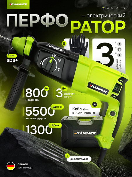 Перфоратор электрический DAMMER мощностью 800 Вт – это мощный и надежный инструмент, созданный для профессионалов и домашних мастеров, которые ценят высокую производительность и качество. Этот перфоратор электрический ударный справляется с широким спектром задач: от сверления отверстий в бетоне до долбления твердых поверхностей, обеспечивая эффективность и комфорт в работе. Скорость холостого хода достигает 1300 об/мин, а частота ударов – до 5500 уд/мин с силой 3 Дж, что позволяет легко работать с бетоном, кирпичом и другими материалами. Перфоратор оснащен тремя режимами: сверление, сверление с ударом и долбление, что делает его универсальным для любых поверхностей. Максимальный диаметр сверления составляет 26 мм для бетона, 30 мм для дерева и 13 мм для металла. Система крепления SDS+ обеспечивает быструю замену оснастки, а защита IP20 предотвращает попадание пыли внутрь корпуса, увеличивая долговечность инструмента. Перфоратор электрический DAMMER оснащен поворотной рукояткой на 360 градусов, системой защиты от перегрузок и перегрева, а также функцией реверса для удобного извлечения буров. Эргономичный дизайн с прорезиненной рукояткой и оптимальным весом гарантирует удобство и точность в работе. Прочный корпус устойчив к ударам, что делает этот перфоратор электрический ударный надежным даже в сложных условиях. В комплект входят: перфоратор, кейс для хранения, буры SDS+ (6 мм, 8 мм, 10 мм), лопатка, пика, ограничитель глубины сверления, фирменные перчатки DAMMER и инструкция на русском языке. Перфоратор DAMMER идеально подходит для строителей, электриков, сантехников и домашних мастеров, выполняющих монтаж, сверление или демонтаж. Этот перфоратор электрический сочетает мощность, надежность и богатую комплектацию, что делает его отличным выбором для любых задач. Закажите перфоратор электрический ударный DAMMER и оцените его преимущества на практике! Команда DAMMER желает вам отличных результатов!