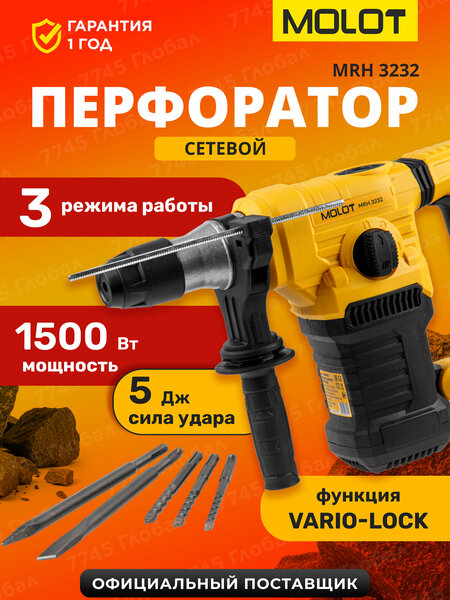 Перфоратор электрический MOLOT MRH 3232 (1325617) - инструмент бытового класса, предназначенный для использования в трёх режимах: сверление, сверление с ударом, долбление. Перфоратор ударный обладает мощным двигателем 1500 Вт и силой удара 5 Дж, что позволяет достигать высокой производительности и делать отверстия в бетоне диаметром до 32 мм. Перфоратор имеет функции регулировки оборотов и выбора угла оснастки (Vario-lock), которые помогут подобрать оптимальный режим работы в зависимости от вида задачи и обрабатываемого материала. Перфоратор также оснащен антивибрационной рукояткой для обеспечения комфорта пользователя во время работы и LED индикатором износа угольных щеток, который позволит осуществить своевременную замену щеток. В комплекте поставки входит: перфоратор сетевой, дополнительная рукоятка, зубило (пика, плоское) - 2 шт, сверло (8, 10, 12) - 3 шт, ограничитель глубины, инструкция по эксплуатации.