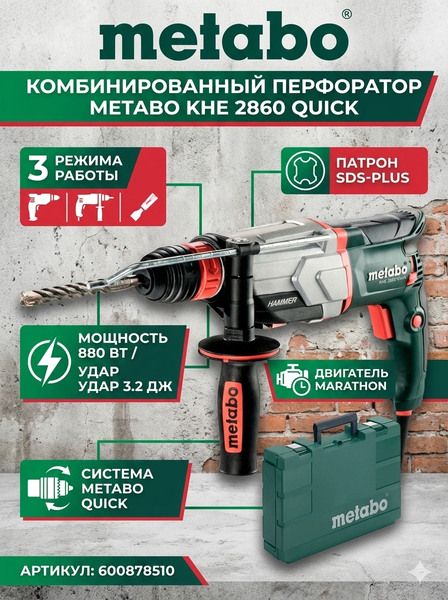 Описание (RU) Перфоратор комбинированный Metabo KHE 2860 Quick (600878510) — надёжный сетевой комбинированный перфоратор с патроном SDS-Plus и системой Metabo Quick для быстрой смены между ударным патроном и сверлильным. Предназначен для бурения с ударом, сверления без удара и долбления в бетоне, камне, кирпиче, дереве и металле. Оснащён мощным двигателем 880 Вт, эффективным ударным механизмом и электроникой Vario (V) для регулировки оборотов под материал. Инструмент сочетает высокую производительность с удобством эксплуатации как в бытовых, так и профессиональных задачах. Технические характеристики (RU) Параметр Значение Модель Metabo KHE 2860 Quick (600878510) Потребляемая мощность 880 Вт Тип двигателя Щёточный, Marathon с защитой от пыли Тип патрона SDS-Plus Количество режимов работы 3: сверление, сверление с ударом, долбление Энергия удара (EPTA) ≈ 3.2 Дж Частота ударов ≈ 4400 уд/мин Обороты холостого хода 0–1150 об/мин Обороты под нагрузкой ≈ 870 об/мин Максимальный диаметр сверления: • бетон (бур) 28 мм • бетон (коронка) 68 мм • дерево 32 мм • металл 13 мм Реверс есть (поворот щёток) Регулировка оборотов есть (Vario) Предохранительная муфта Metabo S-automatic Длина кабеля ≈ 4 м Вес (без кабеля) ≈ 3.1 кг Производитель Metabo (Германия — бренд) Комплектация (RU) Перфоратор Metabo KHE 2860 Quick (600878510) Дополнительная боковая рукоятка Ограничитель глубины сверления Пластиковый кейс (MetaBOX) для хранения и транспортировки Ключевые преимущества (RU) Система Metabo Quick для быстрой смены патронов без ключа Надёжный двигатель Metabo Marathon с защитой от пыли для долговечной работы Три режима работы: бурение, сверление с ударом и долбление Электроника Vario (V) для адаптации скорости под материал Предохранительная муфта S-automatic для защиты оператора при заклинивании