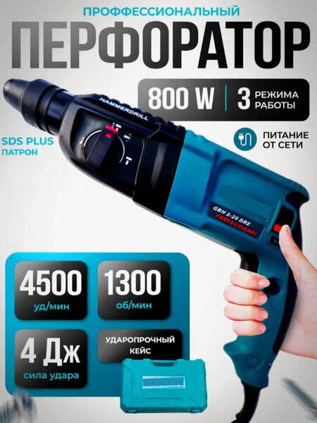 Перфоратор SDS PLUS — это высококачественный инструмент, предназначенный как для профессионалов, так и для домашнего использования. Устройство оснащено 3 режимами работы: бурение, перфорация и долбление, что позволяет эффективно работать с различными строительными материалами. Максимальный диаметр бурения составляет 26 мм, а мощность перфоратора достигает 1000 Вт. Этот инструмент отличается высокой производительностью, точностью и долговечностью, что делает его отличным выбором для строительных и ремонтных работ. Основные характеристики: Технические параметры: Модель: 3x режимный перфораторРежимы: 3 режима (бурение, перфорация, долбление)Максимальный диаметр бурения: 26 ммМощность: 1000 ВтТип патрона: SDS PLUS для быстрой замены оснасткиЧастота ударов: высокая частота для эффективной работы с твердыми материаламиОбласть применения: Работы с твердыми материалами: бетон, камень, кирпич, керамикаСтроительные, ремонтные и монтажные работыИдеален для бурения отверстий, выполнения перфорации и долбленияПодходит как для профессиональных, так и для домашних мастеровУдобство эксплуатации: Эргономичный дизайн для комфортного и продолжительного использованияВозможность выбора режима в зависимости от задачВысокая производительность и длительный срок службыБезопасность: Удобная и безопасная рукоятка для комфортной работыСистема защиты от перегрева для долгосрочной эксплуатацииПрочные материалы, обеспечивающие защиту от повреждений при паденииКомплектация: ПерфораторСпециальные насадки (для бурения и перфорации)Руководство по эксплуатации и меры безопасностиДополнительные аксессуары (по необходимости)Рекомендации по эксплуатации: Соблюдайте инструкции по эксплуатации и уходу за инструментом. Используйте правильные насадки в зависимости от материала и типа работы. Убедитесь, что инструмент используется при комфортной температуре и в благоприятных условиях. Меры безопасности: Избегайте падений и сильных ударов. Используйте защитные очки и другие средства индивидуальной защиты при работе с перфоратором.
