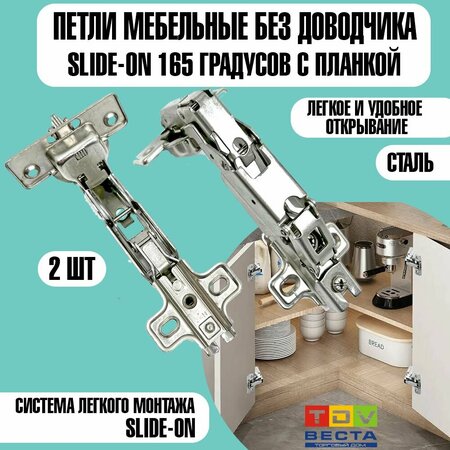 "Петля 165* Slide-on с отв. планкой Н=2 •Угол открывания: 165 ° •Мин. толщина фасада: 16 мм •Диаметр фрезеровки под чашку: 35 мм •Глубина фрезеровки под чашку: 11,5 мм •Крепление чашки: Под саморез •Тип фасада: Для деревянных фасадов.