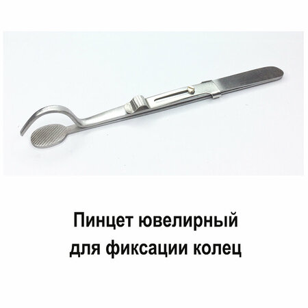 Ювелирные металлические пинцеты для колец с фиксатором применяются для фиксации колец или круглых заготовок. Легкий и прочный пинцет с фиксатором незаменим для ювелирных и декоративно прикладных работ - при пайке колец, проволоки и круглых деталей, при создании украшений, для моделизма, для декоративно прикладных работ, в нумизматике. Длина пинцета 140 мм. Насечка на губках пинцета не даёт предметам выскальзывать, а фиксатор позволяет зажимать детали для дальнейших манипуляций.