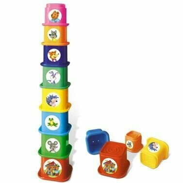 Пирамида состоит из 8 элементов. Высота пирамиды: 33 см. Материал: пластик. Соответствует требованиям безопасности и стандартам качества продукции. Для детей от 1 года. Красочная пирамидка с изображениями героев сказки "Теремок" Состоит из стаканчиков разного размера, которые надеваются друг на друга. Развивает логику, усидчивость и воображение. Изготовлена из безопасного пластика.