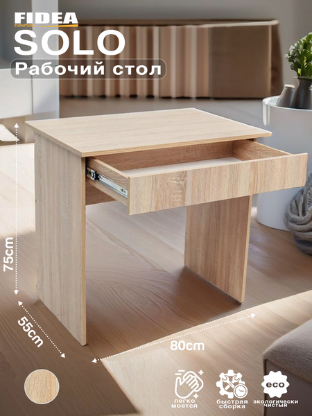 Письменный, компьютерный стол SOLO из ЛДСП с ящиком: комфорт и функциональность Стол SOLO из ЛДСП с ящиком станет отличным выбором для тех, кто ценит комфорт и функциональность. Благодаря своим размерам (80 × 55 × 75 см), стол достаточно вместителен, но при этом не занимает много места. Стол изготовлен из высококачественного ЛДСП, которое отличается высокой прочностью и устойчивостью к царапинам и повреждениям. Это гарантирует долгий срок службы и сохранение первоначального вида стола. Строгий и современный дизайн стола SOLO подойдет для любого интерьера, будь то домашний кабинет или офисное рабочее место. Выдвижной ящик стола SOLO позволяет удобно хранить канцелярские принадлежности и мелкие предметы, что делает рабочее место еще более организованным. Стол SOLO легко собирается благодаря подробной инструкции, которая идет в комплекте. Устойчивость и надежность конструкции стола SOLO гарантирует безопасность и комфорт во время использования. Экологически чистые материалы, из которых изготовлен стол, безопасны для здоровья и окружающей среды. Стол SOLO подходит для использования как дома, так и в офисе, обеспечивая комфортное рабочее или учебное пространство. Создайте удобное рабочее место уже сегодня с письменным, компьютерным столом SOLO из ЛДСП с ящиком!