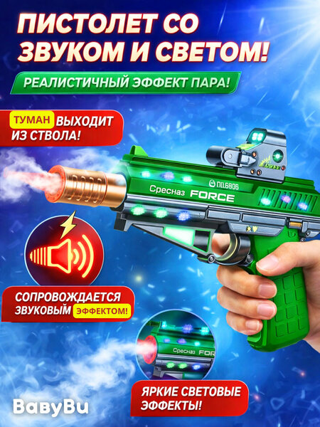 Ледяной, Лесной зеленый, Манго цвета Реалистичный подвижный механизм имитирует работу настоящего оружия и обеспечивает эффект полного погружения в игру. Телескопический ствол с эффектом дыма создаёт зрелищные визуальные эффекты во время «стрельбы». Если дым не появляется, добавьте несколько капель чистой воды в отверстие для залива воды. Если эффект по-прежнему отсутствует, слейте воду, промойте резервуар и наполните его чистой водой. Световые и музыкальные эффекты дополняют игровой процесс, усиливая сенсорные впечатления. Встроенная вибрация при нажатии делает игру более реалистичной и динамичной. Игрушка подходит для мальчиков и девочек и станет отличным подарком на день рождения, праздник или в качестве сюрприза. Изготовлена из качественных и безопасных для детей материалов, отличается прочностью и надёжностью. Работает от 4 батареек типа AA (в комплект не входят). Идеальна для сюжетно-ролевых и активных игр, развивает воображение и фантазию.