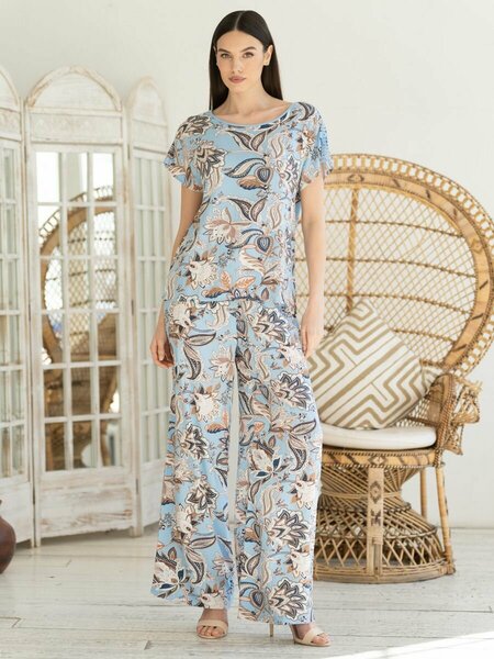 Стильный комплект Vita от Mia-Amore — идеальное решение для комфортного домашнего образа. Название, вдохновлённое жизненной энергией (Vita с итальянского означает «жизнь»), полностью отражает динамичный и современный характер модели. Комплект состоит из двух гармонично сочетающихся элементов: элегантного топа с коротким рукавом и удобных широких брюк. Топ украшен изящной ажурной хлопковой тесьмой вдоль линии плеч, что придаёт модели особый шарм и утончённость. Особого внимания заслуживает качество исполнения: принтованная тканая вискоза создаёт неповторимый визуальный эффект, а продуманный крой обеспечивает свободу движений. Брюки оснащены удобными карманами по бокам, что делает комплект ещё более практичным для повседневной носки. Премиальная вискоза в составе (100%) гарантирует исключительный комфорт при носке. Материал отличается высокой гигроскопичностью, приятной на ощупь текстурой и отличной воздухопроницаемостью. Ткань не электризуется, не вызывает раздражения на коже и сохраняет первоначальный вид после множества стирок. Этот комплект станет незаменимой частью домашнего гардероба, идеально подходя как для отдыха, так и для встреч с близкими. Универсальный дизайн позволяет создавать разнообразные образы, а высокое качество материалов обеспечивает длительное использование без потери привлекательного внешнего вида.