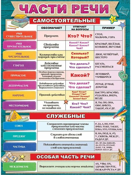 Плакат школьный на стену, части речи, русский язык, детский