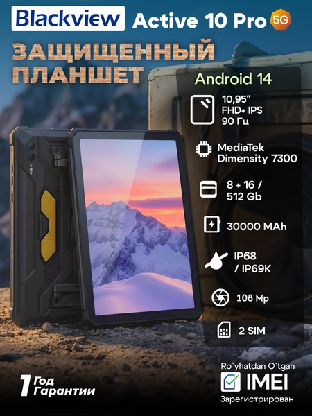 Blackview Active 10 Pro — это мощный защищённый планшет, созданный для работы, путешествий, экстремальных условий и активного образа жизни. Он сочетает в себе высокую производительность, современную связь 5G, увеличенную автономность и прочный корпус, соответствующий военным стандартам защиты. Планшет оснащён большим 10,95-дюймовым IPS-дисплеем с разрешением 1920×1200 пикселей и частотой обновления 90 Гц, обеспечивающим плавную прокрутку, чёткое изображение и комфортную работу как на улице, так и в помещении. Экран защищён дополнительным покрытием, устойчивым к царапинам и повреждениям. В основе устройства лежит современный процессор MediaTek Dimensity 7300, выполненный по 4-нм техпроцессу. В сочетании с 12 ГБ оперативной памяти и 512 ГБ встроенного хранилища планшет легко справляется с многозадачностью, ресурсоёмкими приложениями, играми и профессиональными задачами. Поддержка карт памяти microSD объёмом до 2 ТБ позволяет хранить большие объёмы данных без ограничений. Blackview Active 10 Pro работает под управлением Android 14 с фирменной оболочкой Doke OS_P 4.0, предлагая расширенные возможности персонализации, улучшенную безопасность и поддержку сервисов Google. Поддержка 5G, двух SIM-карт, Wi-Fi 6 и Bluetooth 5.4 обеспечивает стабильное и быстрое соединение в любых условиях. Фотовозможности планшета представлены двойной основной камерой 108 + 20 Мп с инфракрасной подсветкой, что позволяет делать качественные снимки даже в полной темноте, а также записывать видео в разрешении 2K. Фронтальная камера 50 Мп отлично подойдёт для видеосвязи, онлайн-конференций и селфи. Главным преимуществом устройства является аккумулятор увеличенной ёмкости 30000 мА·ч, который обеспечивает до 30 часов воспроизведения видео, 132 часов прослушивания аудио и длительную работу без подзарядки. Поддержка быстрой зарядки 55 Вт значительно сокращает время восстановления энергии. Корпус планшета выполнен из металла и усиленного пластика и соответствует стандартам IP68/IP69K и MIL-STD-810H, что гарантирует защиту от воды, пыли, ударов и экстремальных температур. Стереодинамики с настройкой Harman Kardon обеспечивают насыщенный и громкий звук, а биометрическая защита (сканер отпечатков пальцев и распознавание лица) повышает уровень безопасности. Blackview Active 10 Pro — идеальный выбор для тех, кому нужен надёжный, производительный и автономный планшет для работы, активного отдыха и сложных условий эксплуатации.