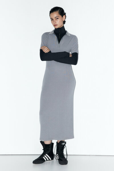 - Платье-поло миди облегающее в рубчик. Длинное женское платье-поло облегающего кроя из мягкой, приятной к телу ткани с фактурой в рубчик - Глубокий V-образный вырез горловины с отложным воротником-поло - Короткие облегающие рукава, прямая линия плеча - Длинная прямая юбка ниже колена без разрезов - Голубое / черное / серое платье-поло с контрастной белой полоской на воротнике - Новая коллекция blokecore следует за трендами сезона и привносит спорт в офисную тему. Расслабленные силуэты в сочетании со строгостью, яркие принты в сочетании с однотоном. Носи это платье с оверсайз-рубашкой или поверх лонгсливов и водолазок, добавляй к образу удобные кроссовки или лаконичные ботильоны с острым носом. Стильное и суперудобное миди в спортивном стиле для строгих образов, которые будут дарить комфорт, а не скованность. Надевай это платье в офис или на учебу в дуэте с классическими вещами для самых смелых и дерзких трендовых аутфитов. Стильное платье-поло подчеркнет твою фигуру и гарантированно не оставит тебя без внимания - Размер на модели: S