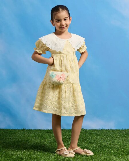 Очаровательное жёлтое платье для девочек из фактурной ткани с крупным белым воротником с вышивкой — игривый и элегантный образ. Отличный выбор как для прогулок, так и для торжеств. Преимущества: Фактурная ткань Y/D Seersucker обеспечивает лёгкость и комфорт Вышитый воротник добавляет утончённости Удобный фасон не сковывает движения Натуральный хлопок приятен к телу Идеально для тёплого сезона Характеристики: Пол: Девочки (2–8 лет) Цвет: Жёлтый Узор: С отделкой Воротник: С воротником Рукав: Короткий Размер модели: 5–6 лет Рост модели: 120 см Уход: Машинная стирка в холодной воде Состав: 100% хлопок, Y/D Seersucker