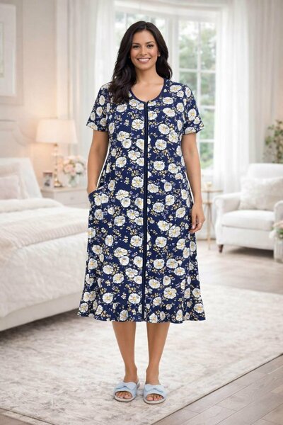 Платье-халат выполнено в удобном и практичном домашнем стиле, идеально подходящем для повседневной носки. Силуэт полуприлегающий, мягко подчёркивает фигуру, не стесняя движений, и обеспечивает комфорт в течение всего дня. Длина изделия — ниже колена, что делает модель универсальной и подходящей для разных возрастов. Короткий рукав аккуратно оформлен и обеспечивает свободу движений, особенно в тёплое время года. Горловина округлая, с аккуратной обработкой, создаёт мягкий и женственный образ. Центральная застёжка выполнена в виде молнии по всей длине изделия — это удобное и практичное решение, позволяющее быстро надевать и снимать халат. Вертикальная линия молнии визуально вытягивает силуэт. Основной цвет изделия — тёмно-синий, украшенный нежным цветочным принтом. Белые цветы с жёлтыми серединками и мелкими декоративными элементами создают лёгкий, свежий и аккуратный внешний вид. Рисунок равномерно распределён по всей ткани и добавляет изделию выразительности. По бокам расположены удобные карманы, которые делают модель ещё более функциональной и практичной для дома. Нижняя часть изделия слегка расширяется, создавая мягкий, свободный силуэт и добавляя комфорта при движении. Ткань выглядит лёгкой, дышащей и приятной к телу, хорошо подходит для ежедневного использования. Образ дополнен мягкими домашними тапочками светлого оттенка, что подчёркивает уютный, спокойный и ухоженный домашний стиль. Такое платье-халат станет отличным выбором для тех, кто ценит комфорт, практичность и аккуратный внешний вид в домашней одежде.
