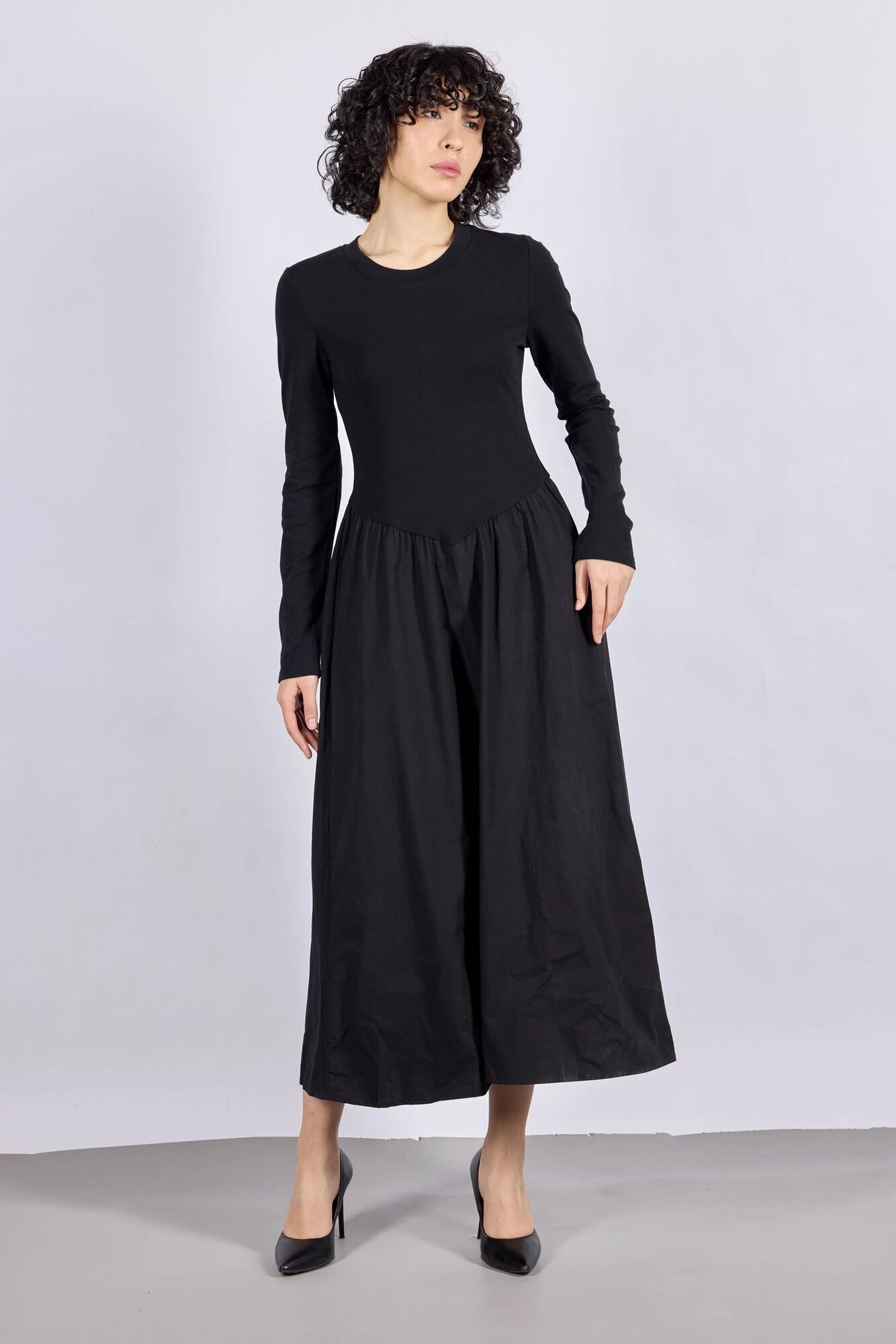 Современное минималистичное платье: верх выполнен из мягкого, эластичного материала, подчёркивающего фигуру, а юбка — из плотной ткани для создания лёгкого объёма. Универсальный выбор для любого случая.