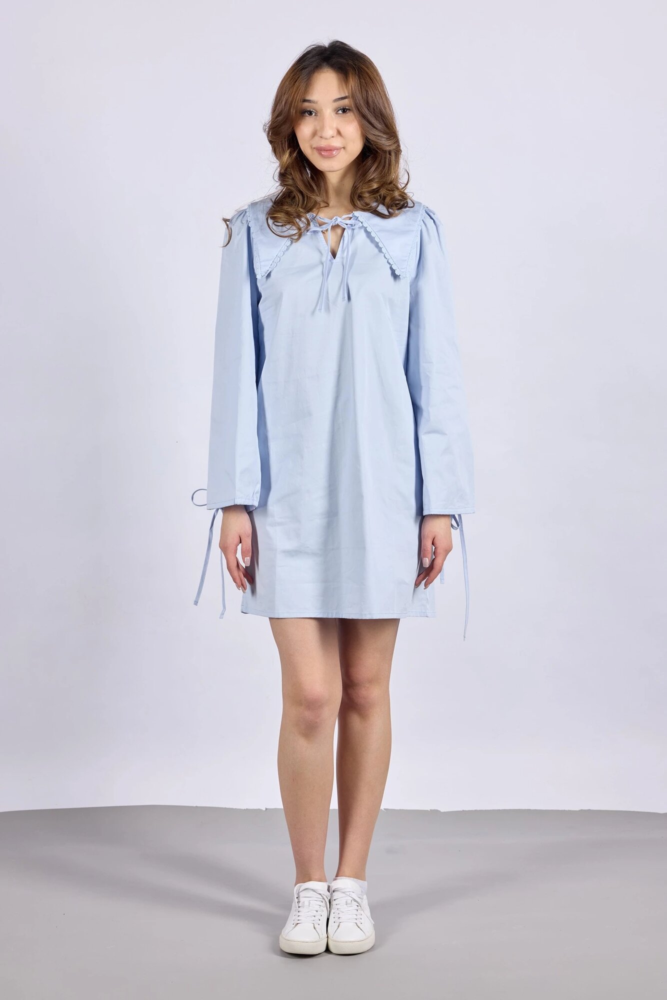 Лаконичное платье мини с крупным отложным воротником и ленточными завязками на манжетах — стильная и элегантная модель, которая идеально подходит для создания утончённых и современных образов.