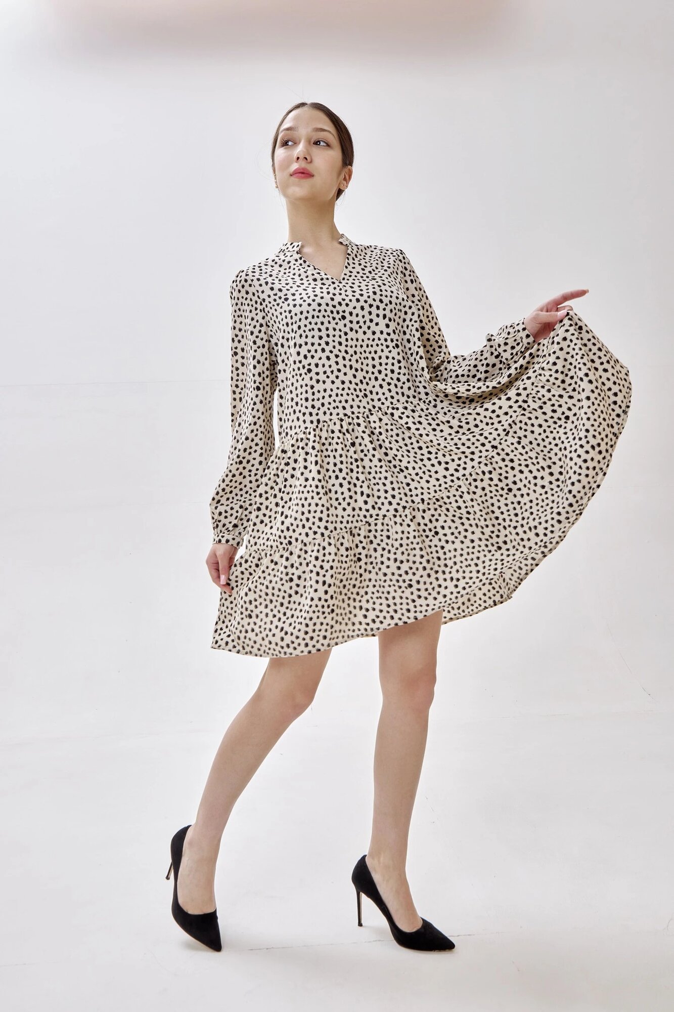 Воздушное свободное платье длины мини с V-образным вырезом, объемными рукавами и расклешенной юбкой с оборкой по низу. Модель выполнена из качественного материала с ромбовидным принтом. Отличный вариант для сочетания как с туфлями, так и ботинками с кедами.