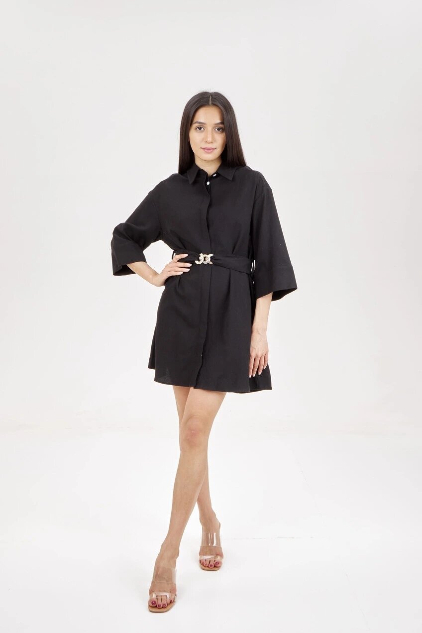 Игривое платье рубашка длины мини с широкими рукавами и расклешенной юбкой. Также модель дополнена супатной застежкой на пуговицы и стильным поясом-лентой в тон.