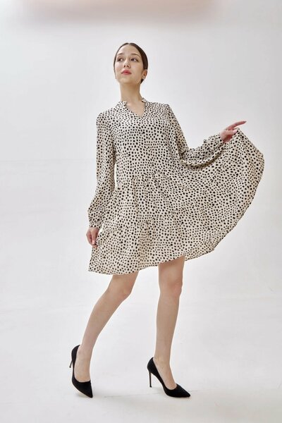 Воздушное свободное платье длины мини с V-образным вырезом, объемными рукавами и расклешенной юбкой с оборкой по низу. Модель выполнена из качественного материала с ненавязчивым пятнистым принтом. Отличный вариант для сочетания как с туфлями, так и ботинками с кедами.