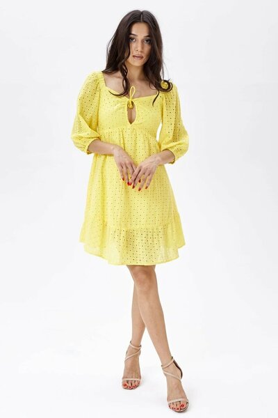 Легкое летнее платье с кружевным перфорированным узором и смелым вырезом на лифе. Пышные рукава с манжетами на резинке и расклешенный подол с широкой оборкой. Имеет подклад и застежку на потайную молнию сзади.