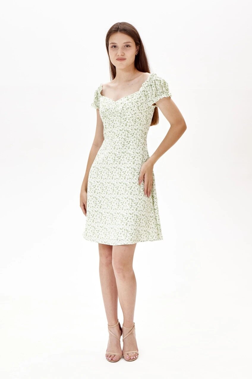 Нежное платье длины мини. Имеет глубокий фигурный вырез и объемные вытачки на лифе, а также короткие рукава буфы на резинках. Станет идеальным вариантом для создания легкого летнего образа.