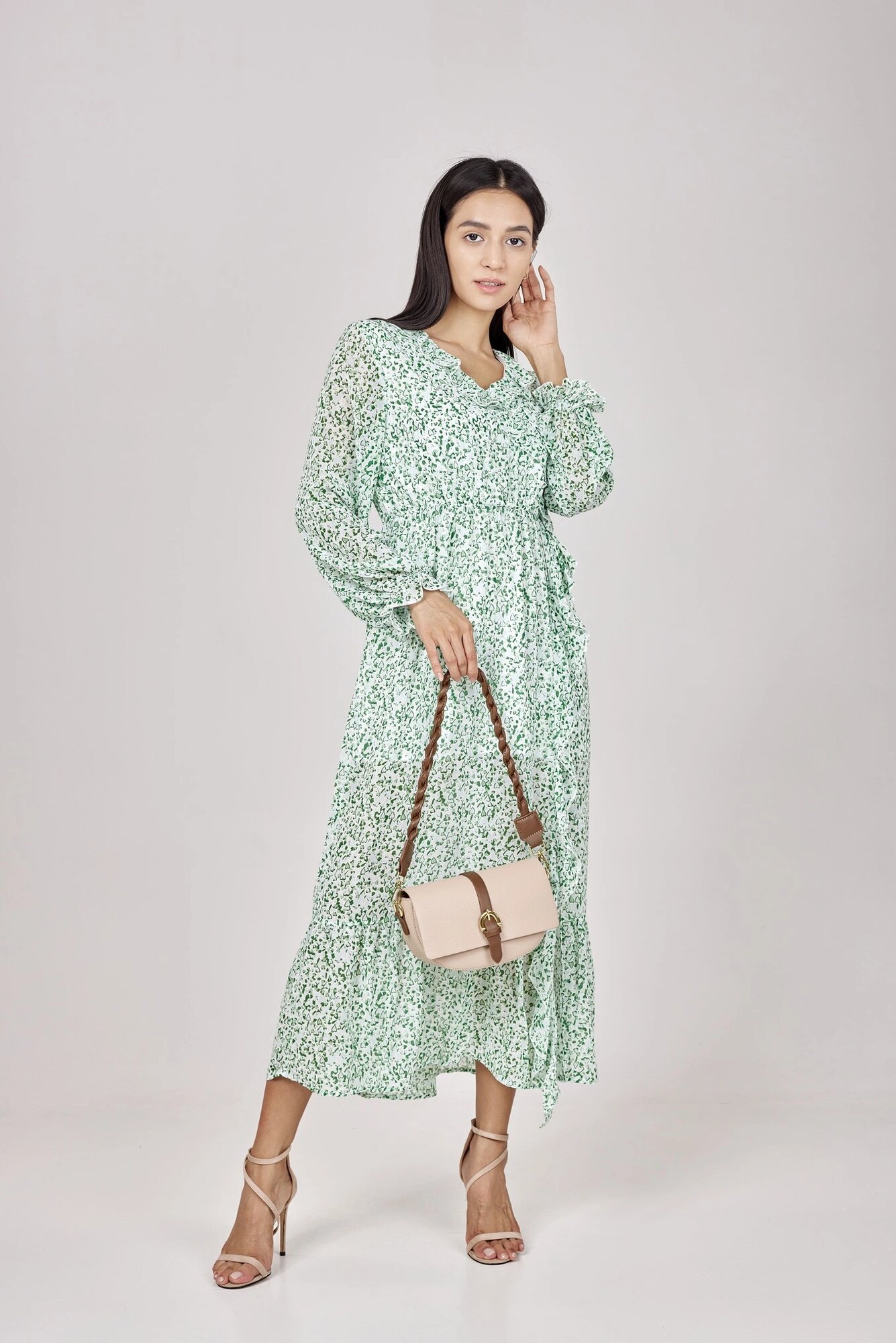 Притягательное струящееся платье длины миди с соблазнительным высоким разрезом. Дополненные нежными оборками V-образный вырез, рукава на резинках и подол юбки добавляют легкости и воздушности. А резинка на талии поможет в комфортной посадке.